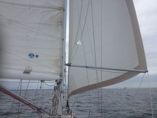 What I noticed next really surprised me: Seb was really moving. Under main alone she was actually sailing pretty well. Better still, with the masthead fly pointed almost directly aft and a slight chop starting to build, she was rock steady. Hey, I thought. How about this. Inspired, I decided to give our whisker pole a try, so I rigged it up with the jib still rolled, then simply unrolled the jib to weather with the sheet running through the end of the pole. The next thing I knew  Seb had picked up another knot and was making very respectable speeds though the water, wing on wing, dead downwind. With no spinnaker. Even more incredible, she was rock steady, and her well-controlled motions meant that the poled-out jib actually stayed filled the vast majority of the time, instead of collapsing and banging full again. The whole experience was so calm that the autopilot could easily be engaged without making scores of battery-draining steering corrections. Fantastic! My speeds ranged from the upper 5 knots in the lulls to well over 7 as the puffs hit – dead down wind, right on the rhumb line. I couldn’t help but start fantasizing about long passages down the trade winds far, far from the Chesapeake Bay.