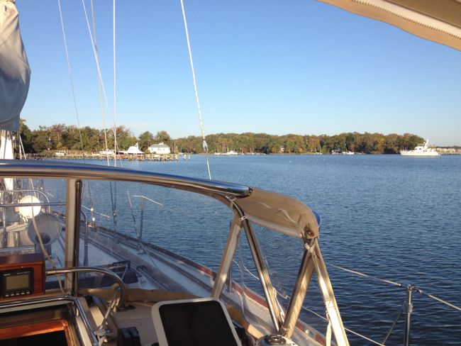 Around lunchtime we fire up the diesel and douse the sails to motor up through the channel off of Tilghman island, which is too narrow to tack up through. During this period we * do * learn that the Sabre can pound. We endure a miserable period belting straight into the waves making only 4-5 knots before clearing the channel and getting back under sail. Lesson learned: on this boat, sail instead of motor whenever possible if you have to go upwind when it’s snotty out!