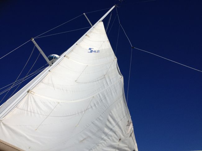 Our sail back doesn’t start out especially well. Looking at the conditions, we opt to hoist the main with the first reef already in it, so with the boat motoring upwind and the main flogging, we tighten the main halyard against the first reef tack ring. Next I start winching in reef line #1. There is a load on it initially, but then it starts to come in very easily. The next thing I know, I am holding the other end of the reef line in my hands, wide eyed. The reef line has come untied from the boom and come completely out the other end. We now have no facility to rig the first reef unless we string the reef line back through the boom or substitute reef line #2 through reef point #1. In these conditions, neither approach holds any appeal. Our options now are to hoist the full main or go right to the second reef.
