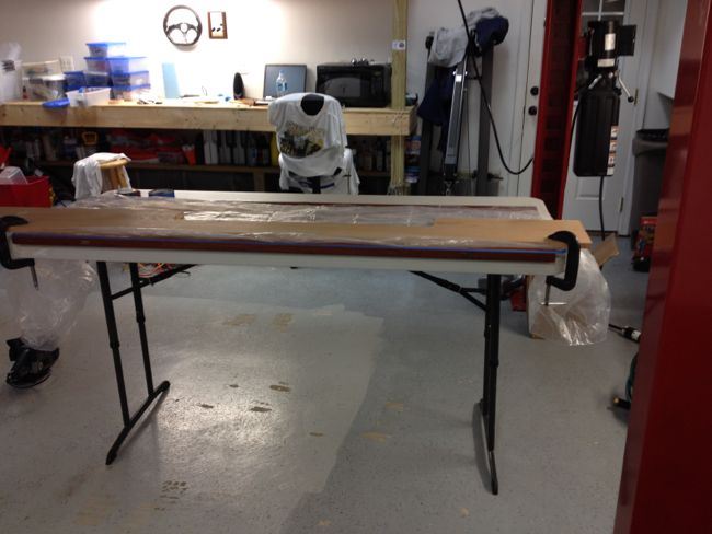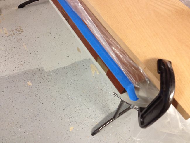 I decided to remove some wood from the hinge edge of the door, and a router is the best woodworking tool I have for the job. So this evening I removed all of the door’s hardware and dug out a good work table. In the basement I found a piece of wood to clamp on as a guide for the router.