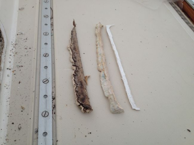 Below: evidence that the portholes sealant had been patched without fully re bedding the portholes. The strip of sealer on the left is from the bottom of the porthole. The dirt on the sealant shows how far water had been making past the outside edge of the sealer toward the interior. The two strips to the right are both from the top of the porthole. The original strip is in the middle; the lighter one on the right was added later when someone tried to stop a leak by cutting out some of the original seal from the outside and adding this new strip. When we bought the boat the porthole didn’t leak in the rain, but did leak when the boat was being sailed. That’s not a very effective fix for a sailboat, now is it?