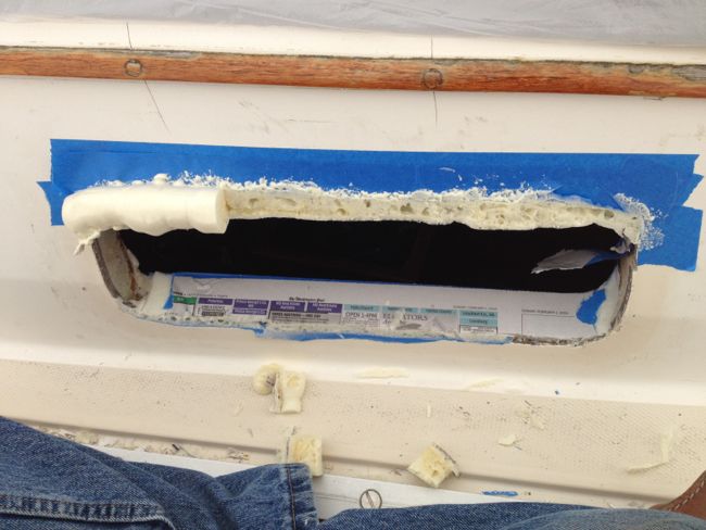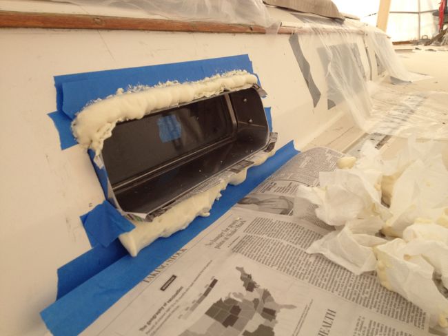 I posted for some Facebook advice back in January and got a great response from a car racing friend – use the same type of expanding foam used to fill gaps in residential window frames. I bought a couple of cans of “Great Stuff” at Home Depot and the advice turned out to be excellent. With the porthole frames in place, I injected the foam and then waited for it to dry overnight.