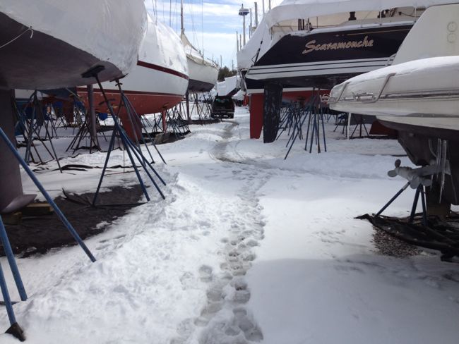 The trek between boat and Suburban is long and slushy, so Saturday morning I did one long load of all of the tools and cables should need for the spring, then dragged my soggy-ass feet aboard to get a start.