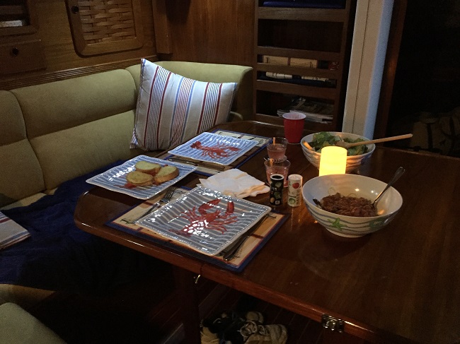 Below: a hot and delicious meal while listening to rain on the deck above.