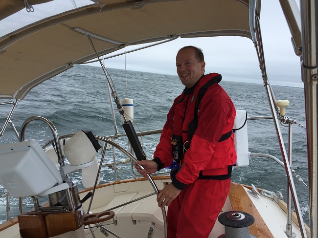 We doused the pole, jibed, and put two reefs in the main before rolling out a reefed jib and beginning the beat back up north toward home.