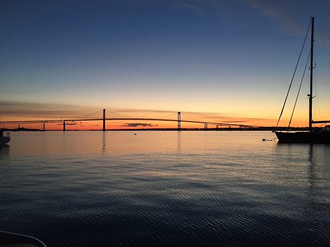 This weekend Lisa and I sailed around the southern end of Conanicut Island to take shelter in Dutch Harbor from Saturday night’s gale warning (the forecast was for gusts up to 35 knots from the east and a driving rain). We had a great sail to and from and enjoyed a blissfully calm anchorage Saturday evening. NOAA weather made good on its threats and the wind made quite a ruckus starting around 3 am but thankfully the island did an excellent job of sheltering us. We had a much better ‘ride’ on the mooring than we would have had on our seasonal mooring, which has little protection from strong easterly winds.