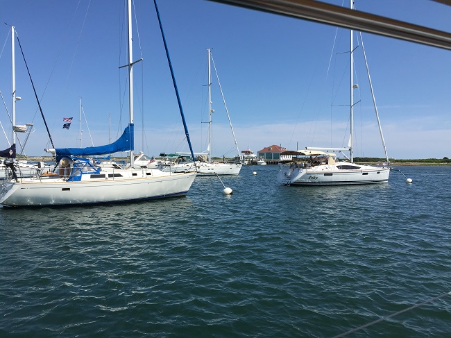 It was a good call: we arrived in time for a late lunch and got one of the last two or three remaining in the inner harbor. The anchorage is crazy protected (read: the anti-Jamestown!) with very densely spaced moorings, so (i) be sure you’re comfortable maneuvering your boat into a very tight “parking space” (literally) and (ii) be ready to raft up. You may be asked to.
