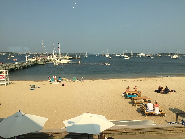 Once we’d cleared the hectic channel (well traveled by ferry and power boat traffic), we arrived in one of the most scenic mooring fields of our trip. Hyannis Yacht Club offers a beach and a superb, recently renovated club house. We luxuriated in showers and cocktails, then decided to take a walk to downtown Hyannis.