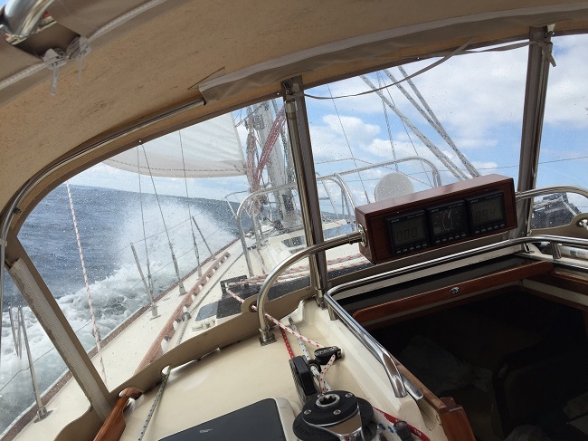 First, this is a brick house of a boat with excellent heavy weather handling. Leaving Block Island we had the current strongly with us, which made for a good pace but which also whipped up a steep chop. We took green water over the bow frequently, even all the way back to (and under) the dodger at one point. During that period a lot of water came on board the boat but were able to isolate the sources fairy quickly. The aft electric toilet was installed by a prior owner and is (we learned the hard way) prone to back-siphoning lots of sea water through the raw water intake hose. We saw a similar problem with the aft head sink drain and cured the leaks by closing both seacocks before embarking on a long process of trying to clear the bilge of many, many gallons of water that sloshed about and emerged from underneath the floor boards on the leeward side of the boat – not exactly a heartening sight! We also learned that the dorade vents all need to be removed completely and replaced with their deck plates in heavy weather after a couple of big green-water incidents soaked the leeward salon cushions. Fortunately, we carry the deck plates aboard for just such contingencies and the dorades were removed shortly thereafter.
