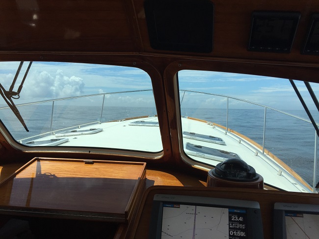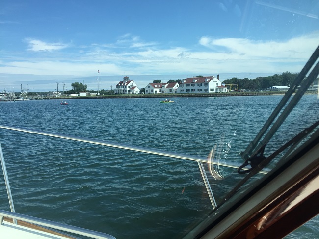 All of the creative talent in the Screen Writers’ Guild couldn’t have conjured better weather conditions for the one weekend this summer when we planned to leave Le Saberage on the mooring and climb aboard our good friends’ Hinckley Talaria 44 for a weekend of power boat cruising. Threatening forecasts to the contrary, we stayed almost 100% dry the entire weekend. Better still, the winds remained almost flat calm every time we needed to make a run to the next destination. The sailboat would have been slow, rolly and dull moving from place to place but the two big turbo Yanmars made nice quick work of each trip at 23 knots. We missed out on absolutely nothing in the way of sailing and covered much more ground than we could have motoring with sails under their covers aboard Seb. Lucky, lucky, lucky!