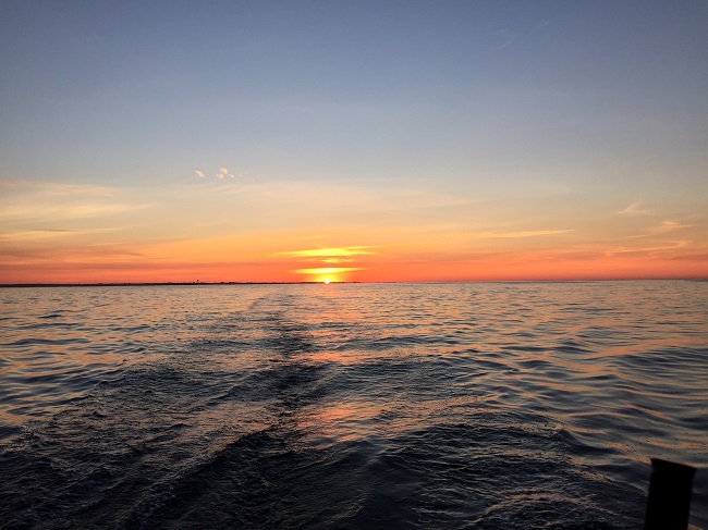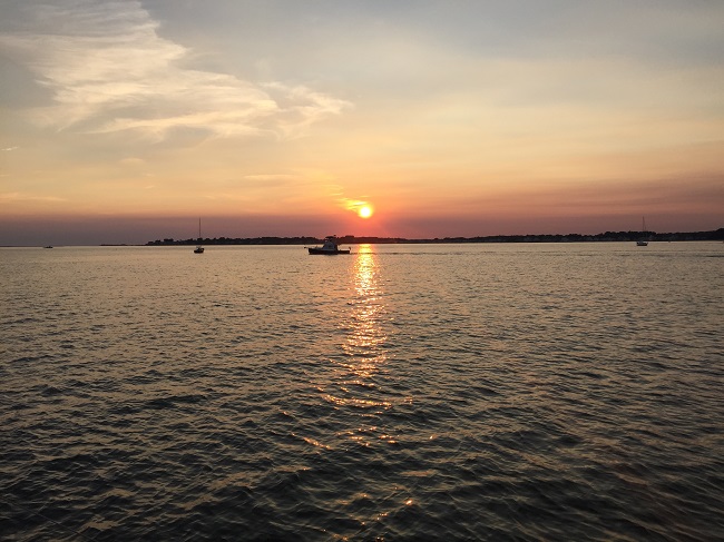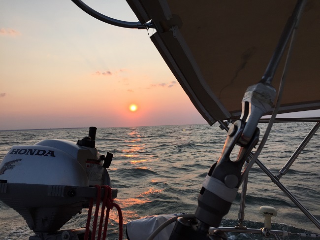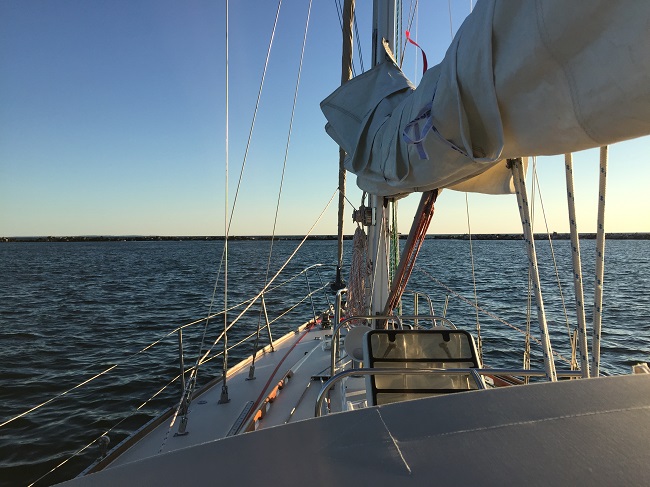 The night stayed relatively calm and I slept well. At my first nighttime potty break the GPS and a glance out the portholes showed all to be well, but at 3am pee time I was more concerned. The current had shifted, pointing Seb’s transom to the Western breakwater and bringing her closer to it than I liked. I briefly considered starting up and moving her further from the wall but decided instead to simply stand an anchor watch until first light, then depart on schedule at 5:45 or so. The anchor watch proved uneventful (thankfully), and it took a great deal of discipline to hold off on departure  until there was enough light to safely navigate. As Mother Nature had it, enough sunlight materialized for a departure exactly where Eldridge would have it for optimal Race timing: 5:45am. I watched the sun rise while motoring west and anxiously monitoring the speed-over-ground for signs of the current beginning to push.