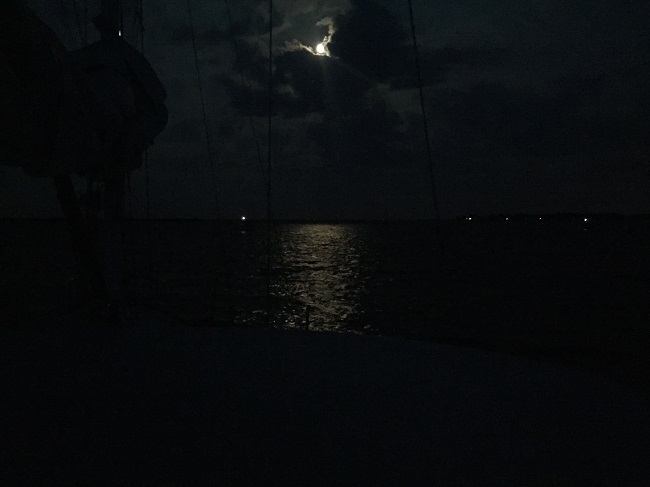 I returned to my now burning chicken in the frying pan after verifying that no one else had anchored to weather of me. I didn’t care enough to see whether my uninvited visitors restored propulsion before drifting into the channel entrance that lay a half mile or so downwind. Other partiers eventually either passed out or departed and a blissfully calm night followed that required no standing anchor watch – just quick GPS and visual position checks at each night time pee break.