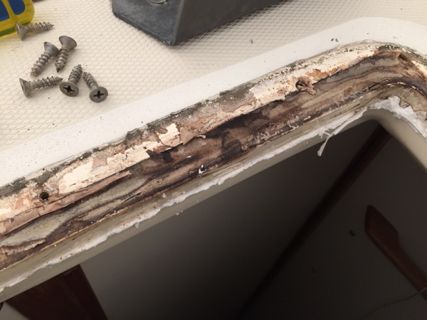 Sure enough: at some point in the past a prior owner had gotten a minor unwanted shower at the hands of the hatch and, instead of removing and rebedding the hatch as common sense (and pride in one’s work) would dictate, s/he decided to inject a bead of sealant around the hatch frame from below. This kind of cheap shortcut will always end with the same result: water will continue leaking into the boat but will migrate along the inside of the headliner to a new location. It will cause at least as much mischief only now will be be doubly troublesome owing to its throughly concealed original entry point.