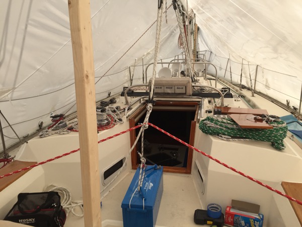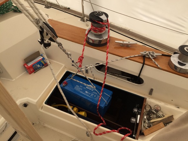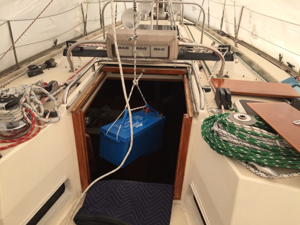 Once each battery was rested on the cockpit floor, the block and tackle mount point was moved to a point just above the companionway.