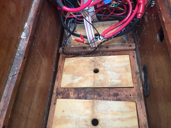 With the batteries’ section of the flooring removed, I could see the issue: the cleats used to support both sides of the flooring were insufficient to support the new load. After getting these cleats back into position I will glass in supports from underneath.