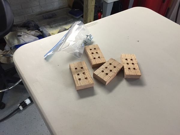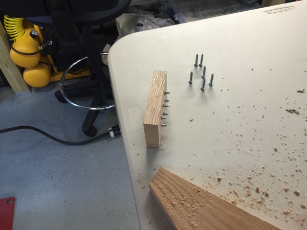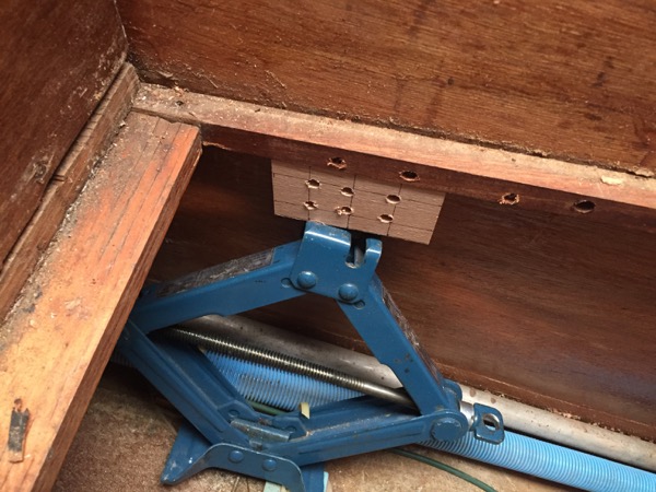 The first step of the repair was to use a car jack to lift the floor back into its original position, then drill new pilot holes and replace the screws that had been torn out. At this stage the cleat (and one small vertical cleat that also been torn loose) were back to their original strength, which has already proven to be inadequate. So I spent some time in the workshop fabricating four additional cleats out of solid oak.