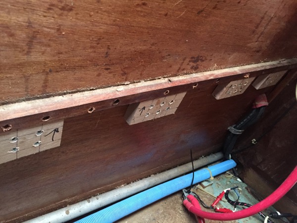 The wall the cleats need to screw into is not very thick, so to prevent sharp screw tips from protruding into the aft cabin, the cleats must be counter sunk only far enough to allow a few threads to penetrate the wall. I chose therefore to include 6 screws with each of the new cleats, increasing the total number of screws securing this side of the shelf by a factor of four.