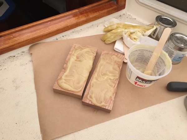 The second and final step in repairing the collapsing battery floor is now complete. The floor had a large unsupported section in the middle of the sail locker that had started to give way. Once I had used the car jack to persuade the floor and related cleats back into position, I re drilled several of the cleat’s screws, then fashioned two wood “feet” to distribute the load of the batteries more widely across the bottom of the boat. I coated the back sides of these feet with epoxy and affixed them to the hull.