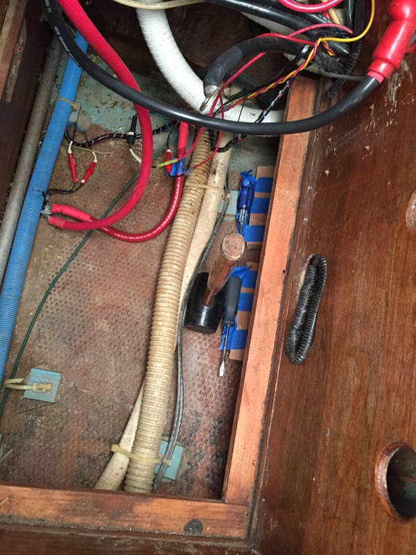 The cleats were both epoxied and screwed to the feet, and the legs, once they were sanded to the correct length, were epoxied to the feet and both epoxied and screwed to the flooring above. This reinforcement should be plenty to support the load of both the batteries and the holding tank. Once the batteries are hoisted back into position, it’s on to other projects!