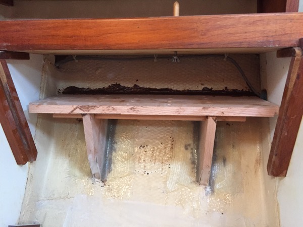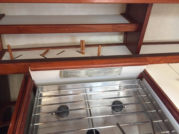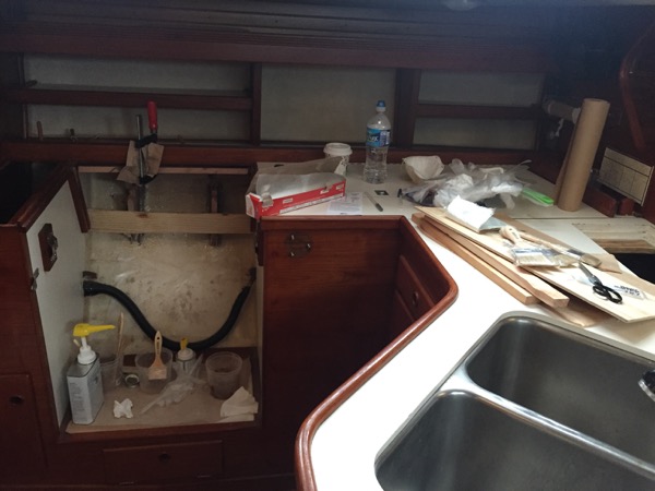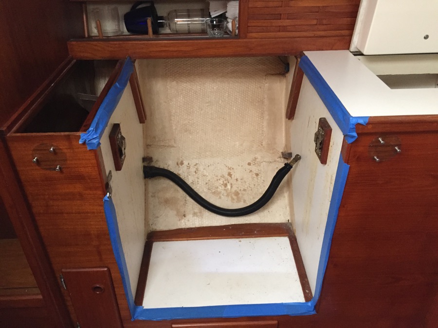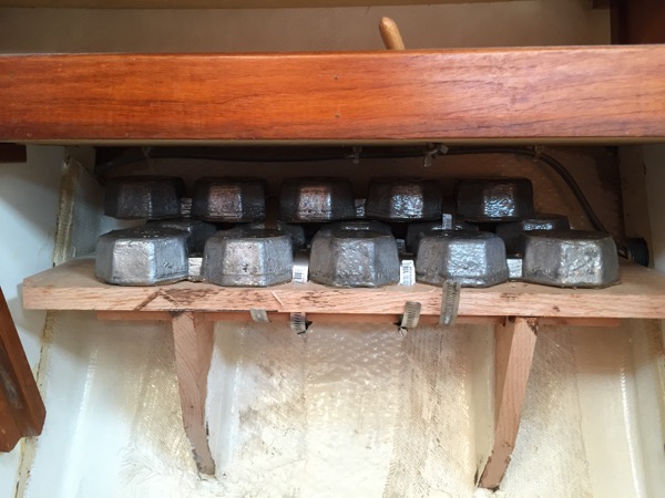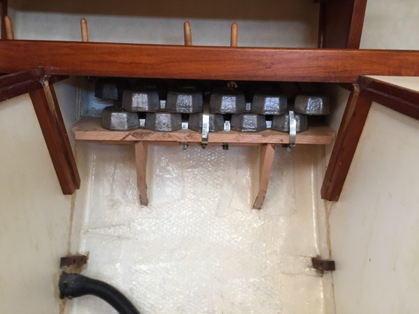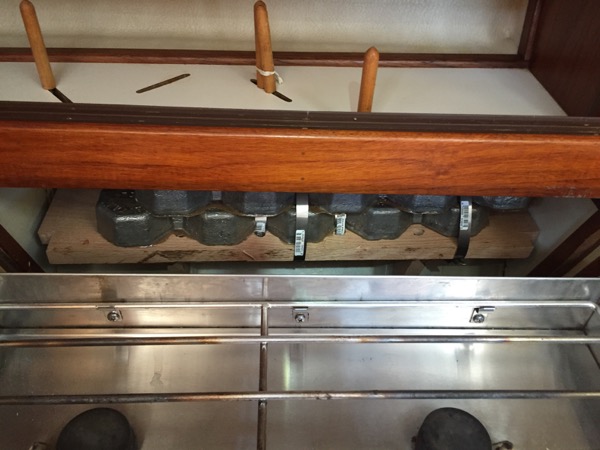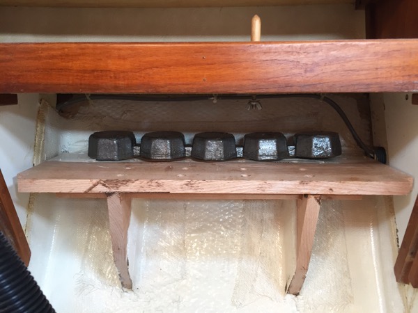 The factory documentation recommends that an out-of-trim condition on Sabre yachts be rectified by bolting lead to the opposite side of the yacht, but the Sabre factory does not offer a counter-ballast kit for the Sabre 42. I considered a variety of places to put the lead but couldn’t find a better candidate than the dead space just outboard of our stove.