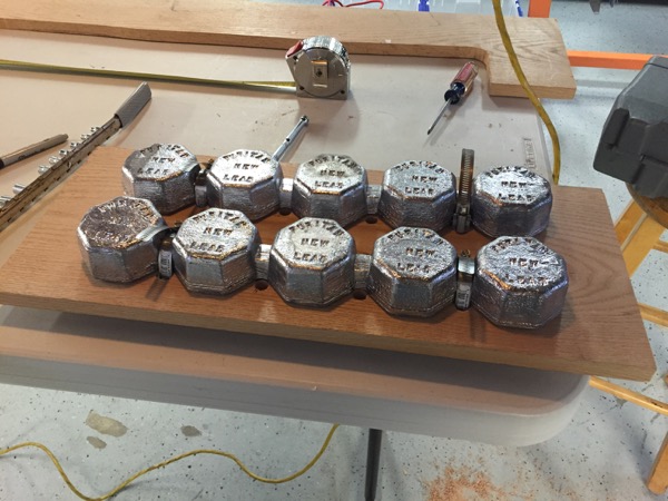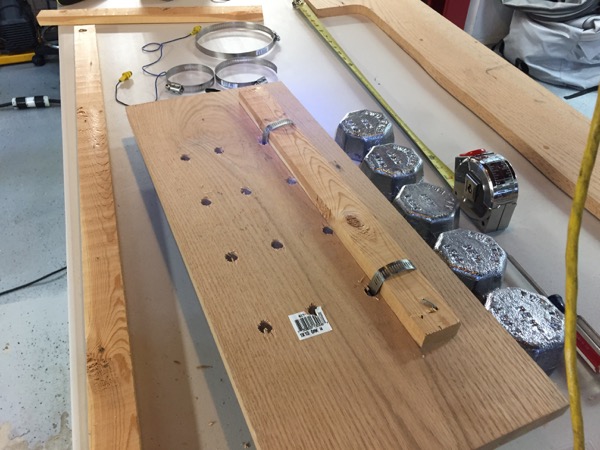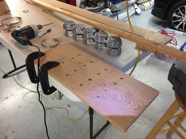 In the shop I pulled out a piece of solid oak (cheap plywood would never do here) and devised a scheme using hose clamps to fasten some lead weights I procured from the local J/70 racing fleet (thanks Peter!) to a section of the board that I cut to the appropriate length.