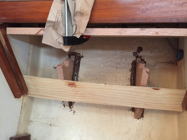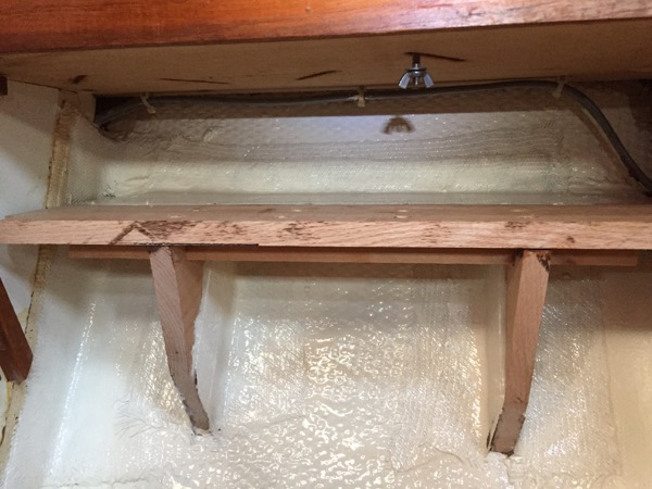 To support my new “shelf” I fashioned solid oak knees, with groves cut in them to accept the wood strips. The bonus here would be that athwartship loads caused by the heeling of the boat would be transferred directly by the pine strips to the knees, meaning that the tabbing holding the shelf to the topside would be assisted by the tabbing fastening the knees.
