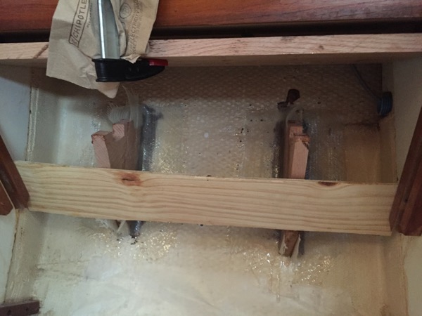 The challenge of using the space? There wasn’t anything nearby to conveniently bolt the lead to. So I decided to pull out the stove and use the project as an excuse to brush up on my fiberglass skills.