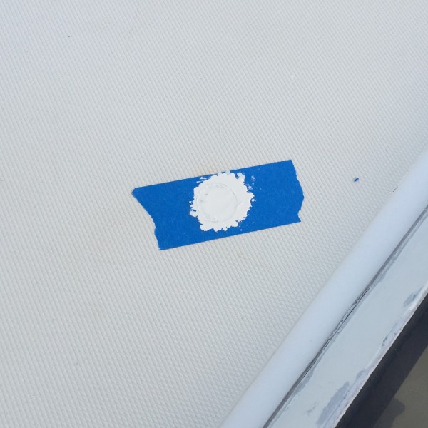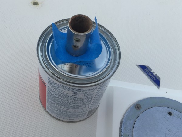 Blech. Since I had nearly a full quart of tan topside pain left over from my counter balasting project, I decided to cover these up. I began by using one of the pulpit mounts as a guide to cut a perfect painter’s tape pattern.