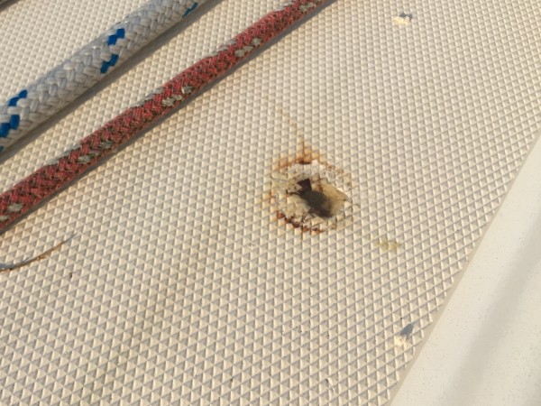 This past weekend, I pulled them out and filled the bolt holes with epoxy, which resulted in six of those ugly brown spots on the deck.