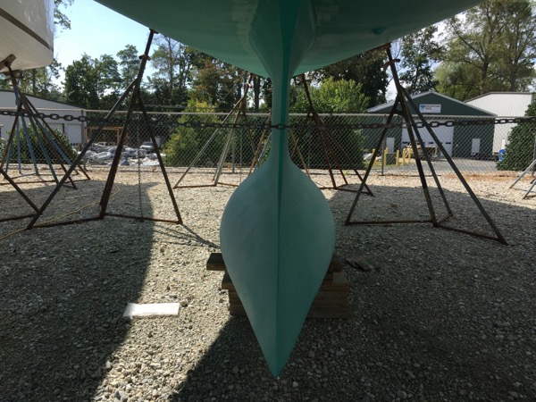 The first thing you’ll notice is the the keel’s overall surface area is quite small relative to the size of the boat. But the EFFECTIVE size of the keel does not include the bulb or the fillet at the top. Let’s look dead on from the front to see how little “real” lifting surface remains with this design (I photographed two examples of 473, which is why one bottom is painted green and one red):