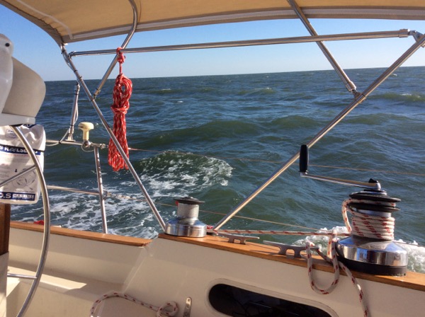 As it happened, the chop in the inlet wasn’t any worse than could be expected under the conditions and it certainly wasn’t dangerous. The going – both in the inlet and outside of it, however, was extremely slow and wet. The Sabre 42 hull form is extremely resistant to pounding when under sail, but any hull will pound when motoring directly into a steep chop. With the motor at full cruise power I found Le Saberage capable of only 4.5 knots or so (down from just under 7 in calm conditions) while shipping massive quantities of water over the deck. It was so rough, in fact, that one of the two commercial fishing boats turned around and headed back to port.