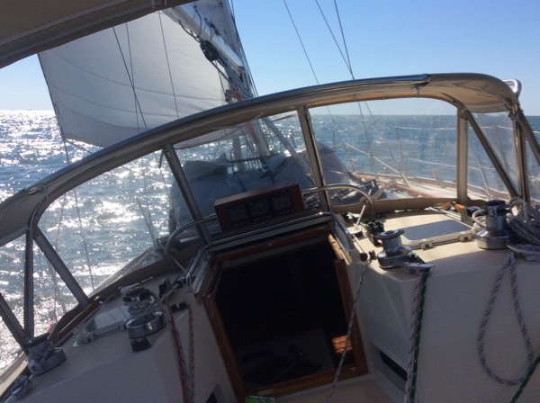 The forecast for the day proved to be partially right. I had left Tangier around 7 and by 10:30 conditions had moderated enough that I set a full main. The promised clock to the right never materialized, however. I was very glad that at least half of the forecast had proven to be correct and exulted in several hours of the best close reaching and beating I can ever remember.