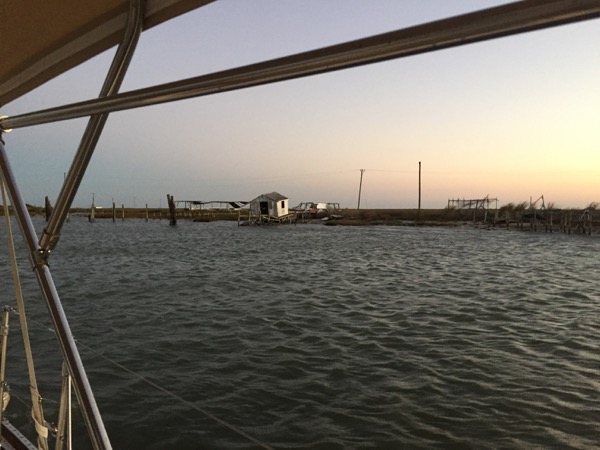 The evening of Sunday, October 23 found me feeling a bit anxious about Monday’s forecast. As I sipped my evening scotch I listened to the weather over the VHF and looked online at Sailflow. The very same 20-25 knot westerly winds that I could hear whistling unrestrained through my Sabre’s rig were forecast to persist the next day – at least until 11am or so. At that point the forecast called for the winds to clock to the right and to moderate. If I left at dawn – which was necessary if I was to ensure a pre-dusk arrival in Hampton, Virginia – I would be leaving the tight Tangier inlet in a brutal chop and would need to beat straight into that same steep chop for 4-5 hours before the wind moderated and I could reach under more civilized conditions.