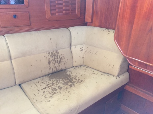 After a while it occurred to me that I had better check below to make sure all was still well. What I found wasn’t good. Although I had removed the dorade vents, copious amounts of water had found their way down the forward port dorade stand pipe – presumably by finding its way through the dorade box’s limber holes – and had soaked the cushions.