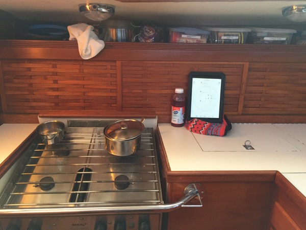 My next problem was the alarming quantity of water gathering the bilge. Although I was confident the source was above the water line – most likely the anchor locker – I still had to deal with the significant practical problem of removing it from the boat. Because Le Saberage was on starboard tack, the water was gathering along the port side of the bilge and failing to drain down into the sump where the primary bilge pump could remove it. After a period of sailing it had over run the top of the forward head sump and begun emerge from under the floor board in the port side of the galley floor. Not exactly a welcome sight! Once the quantity of water grew large enough to warrant the action, I decided I had no choice but to ease the jib well out – just short of luffing – to stand the boat up so the water would drain. This tactic worked – but only when I stood a “bilge water watch” by periodically clearing the bilge pump pickup while the pump ran. The water had sloshed around enough novel parts of the bilge to find all manner of debris which it delivered in turn to the bilge pump pickup. Between these adventures below I did get some very satisfying time at the helm, gleeful in the spirited conditions. My only regret was the distraction from the fun imposed by the water issues below.