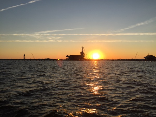For those heading down “The Ditch” from the Chesapeake, the intracoastal waterway really begins with a passage through Norfolk Virginia. Here travelers will enjoy the awesome spectacle of our nation’s Navy warships. I got an extra treat by enjoying a sunrise timed just perfectly as a backdrop to my photos.