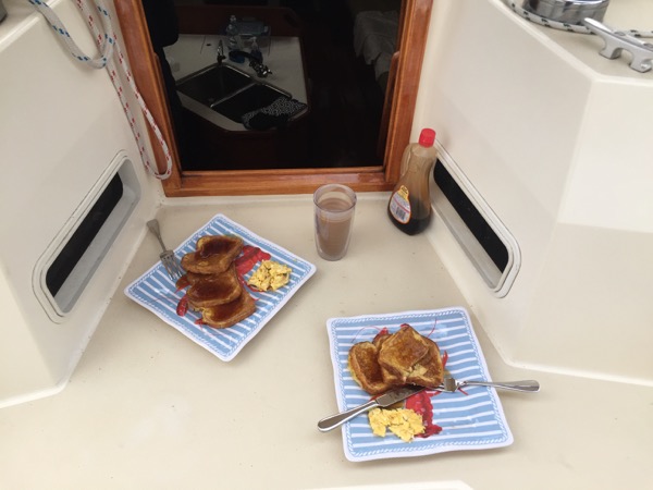 Next we earned our keep as crew aboard Le Saberage by lavishing attention upon her. She got a tank full of diesel, a deck wash down, a holding tank pump out and a fresh water top off. By the time cocktail hour came she was purring like a kitten and so were we.