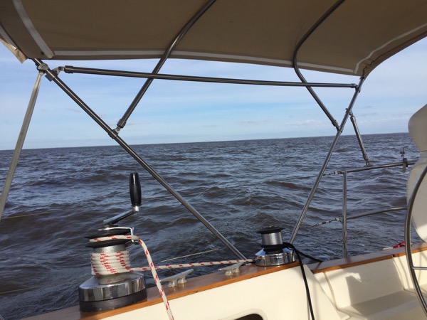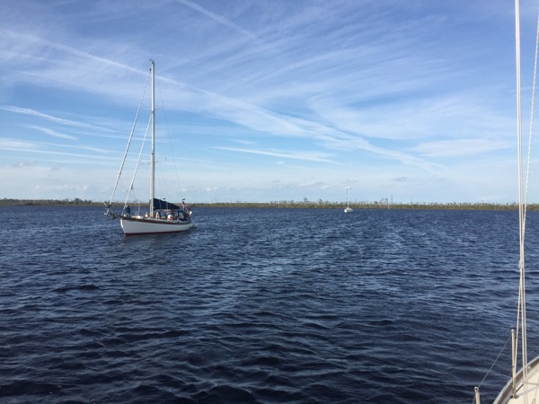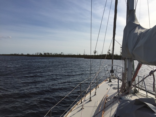 As we experienced elsewhere on the ICW, the scenery changes can be abrupt and dramatic. South of the swamp lands we burst out into the Albermarle Sound. This wide open body of water can be rough in high winds but we experienced very benign conditions that even allowed us to unroll the jib and pick up a knot of extra speed for much of our Sound crossing.