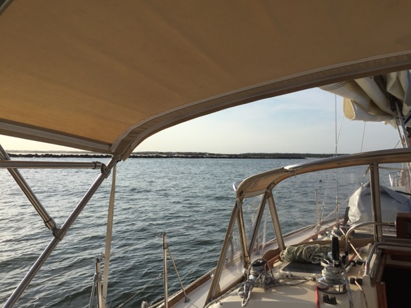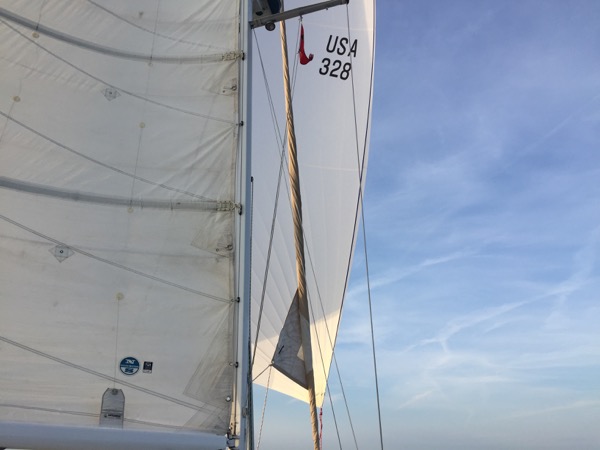 Not good! To make up that kind of deficit I’d need to find sustained speeds over 7 knots for a considerable period of time. The good news was that I had a solid 15 knot breeze coming from the quarter, so as soon as I cleared the inlet (and its foul current) I decided to use the tools at hand: I set the spinnaker. The process doesn’t go quite as quickly when single handed as does keying the preceding sentence into WordPress, but once I got the kite up Le Saberage leapt forward to a 7.5 knot hull speed.
