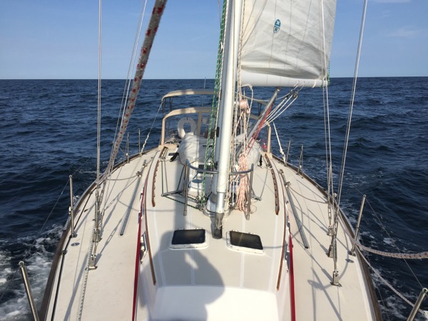 That resulted in some decent down wind sailing until the forecast failed me and the winds lightened enough that I needed to motor sail. So I rolled the jib, started the diesel, and started motor sailing. Once again Le Saberage was making 7.5 knots, only this time directly on the rhumb line to Wrightsville Beach.