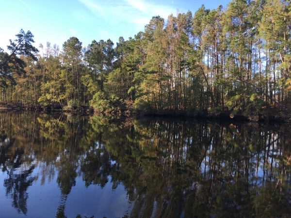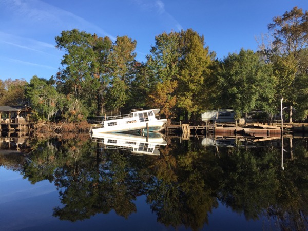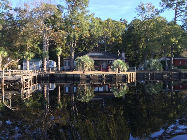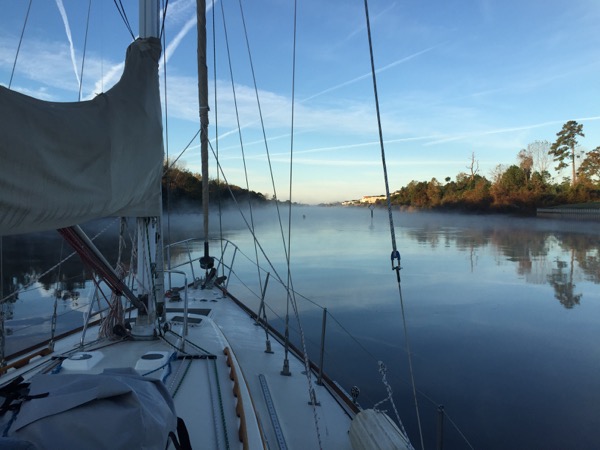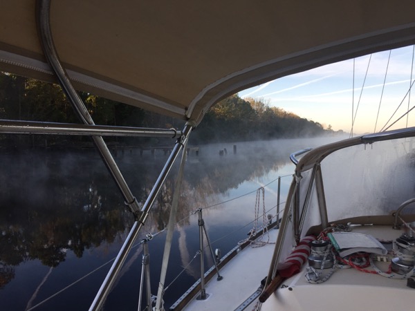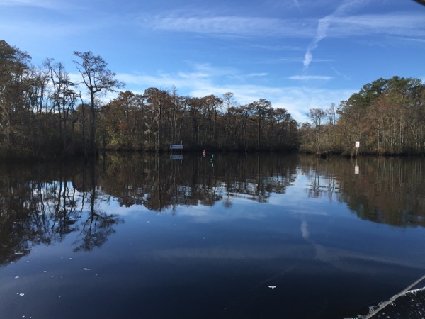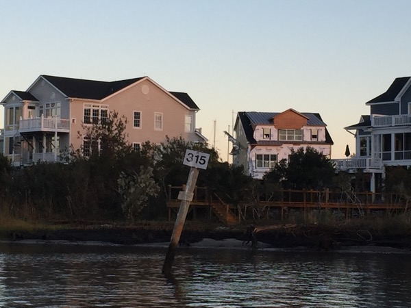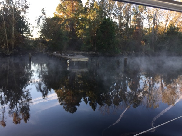 Next it was on to the Minum Creek 2 anchorage just west of the Winyah Bay inlet. During the last two ICW passages I’d had favorable currents and I knew at some point that the check would come due. On this passage it did, and I found myself in a foul mood fighting an even more foul current for much of the day. The day started out in thick fog, which meant motoring only at idle speed to start with. It was on this passage that I encountered by far the narrowest section of the ICW. A temporary mark warns mariners of a shoal extending across more than half of the of ICW directly adjacent to a collapsing dock on the opposing shore. Only 50-60 feet separate them and both loomed ominously out of the fog as I approached. Glad I would never think to try ICW passage making at night!