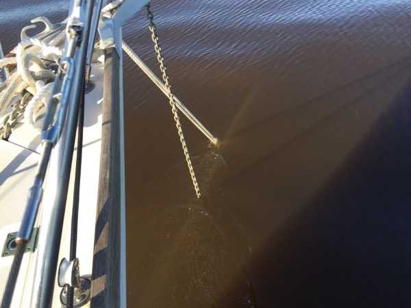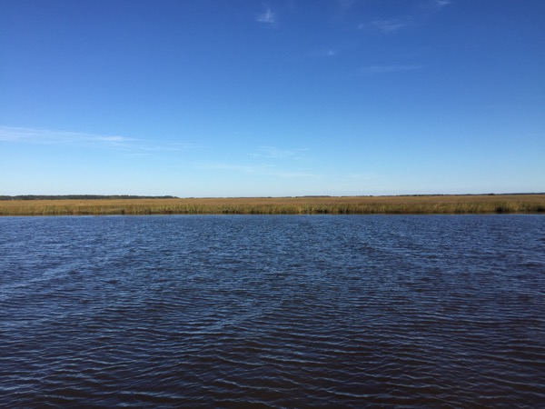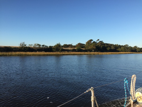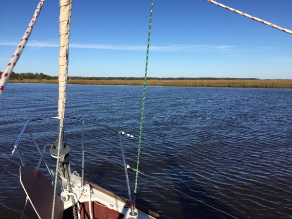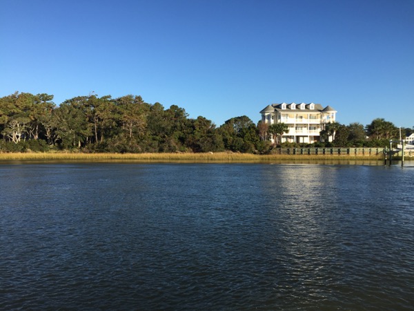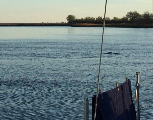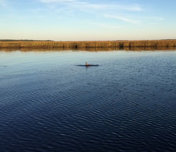 Fortunately the swamp passage only takes an hour or two at sailboat motoring speeds and then the scenery opened up again. Winyah Bay was quite scenic, and the Minum Creek anchorage, which was in marsh land, was astoundingly beautiful. It almost made up for the swamp. Almost, but not quite. Periodic visits from adolescent dolphins were a significant cherry on top to a night in this awesome setting.