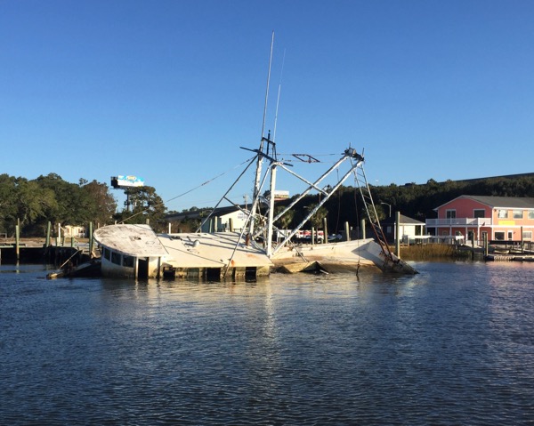 Next it was on to Myrtle Beach, South Carolina where I ducked in to the Marina at Grande Dunes. It was during this leg that I experienced some of the more alarming shoaling I encountered during the trip, particularly around the Lockwoods Folly inlet. In fact several small inlets are encountered during this leg, often with dolphins serving as traffic cops. Very cool. There were some less scenic scenes encountered along this stretch as well, including the very odd sighting of multiple wrecked and abandoned commercial fishing trawlers. I have no idea why the wrecks aren’t being cleared.