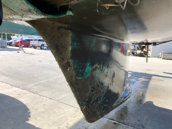 We knew when we bought Rover that her bottom paint was toast and that her keel epoxy was flaking off the lead, so we weren’t too surprised to see what a couple of additional months had done with no effective bottom paint left.
