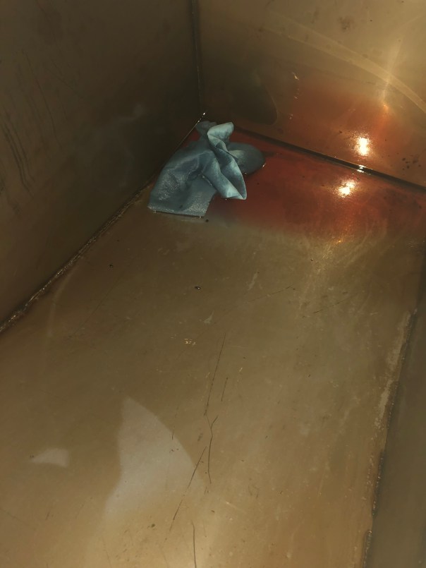 Because of the baffling in these tanks, there are considerable areas we can’t reach but with the last residues of fuel out of the tank we clean every surface we can with shop towels.