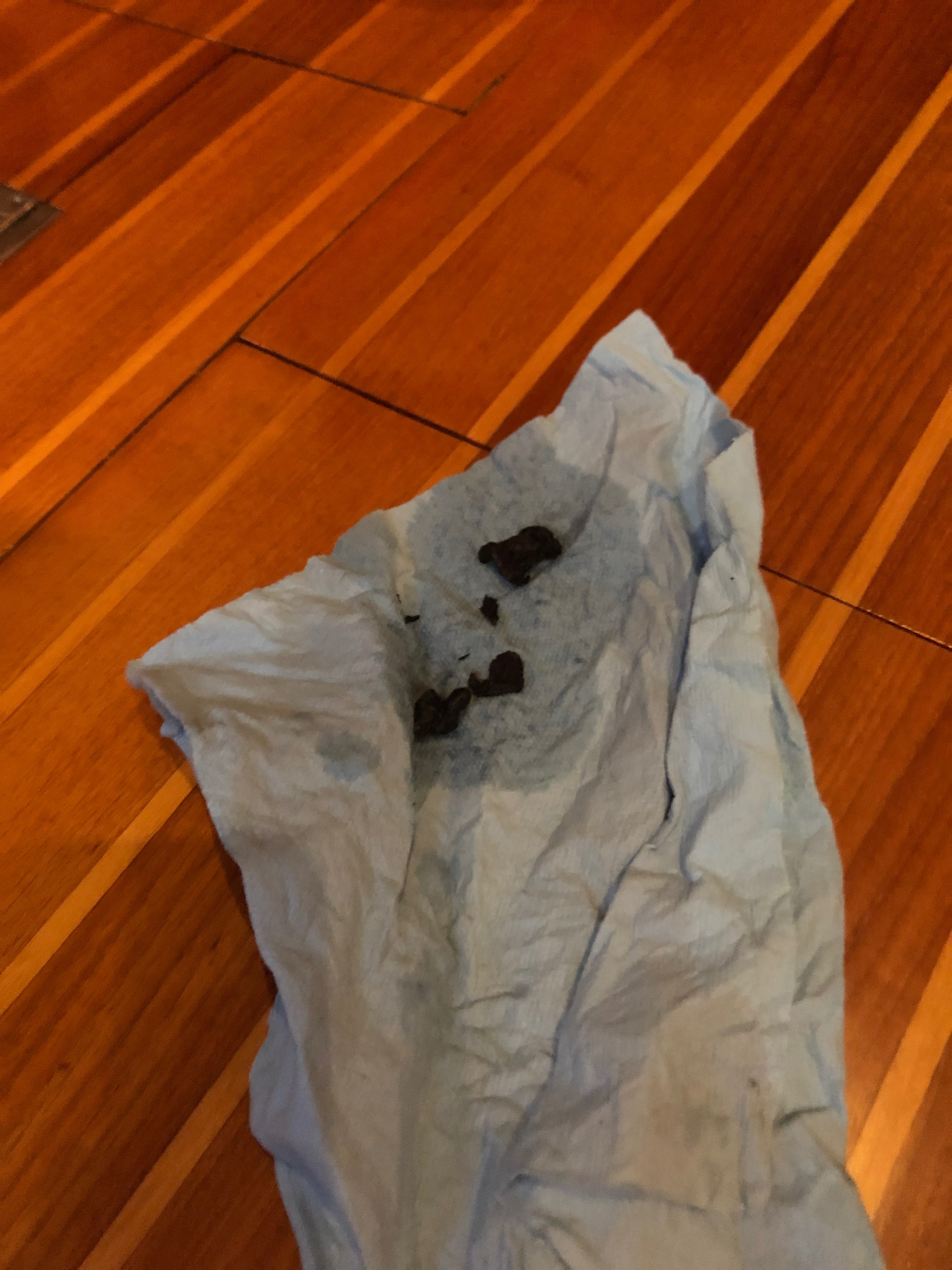 The residual fuel in the bottom of the tank (which lives below the pick up tubes) needs to be pumped out first. On our boat it was well over a year old and smelled foul. This first step catches a lot of the microbe contamination we’re hunting for as well – clumps of which can be seen at the bottom of our 94 gallon port forward tank below.