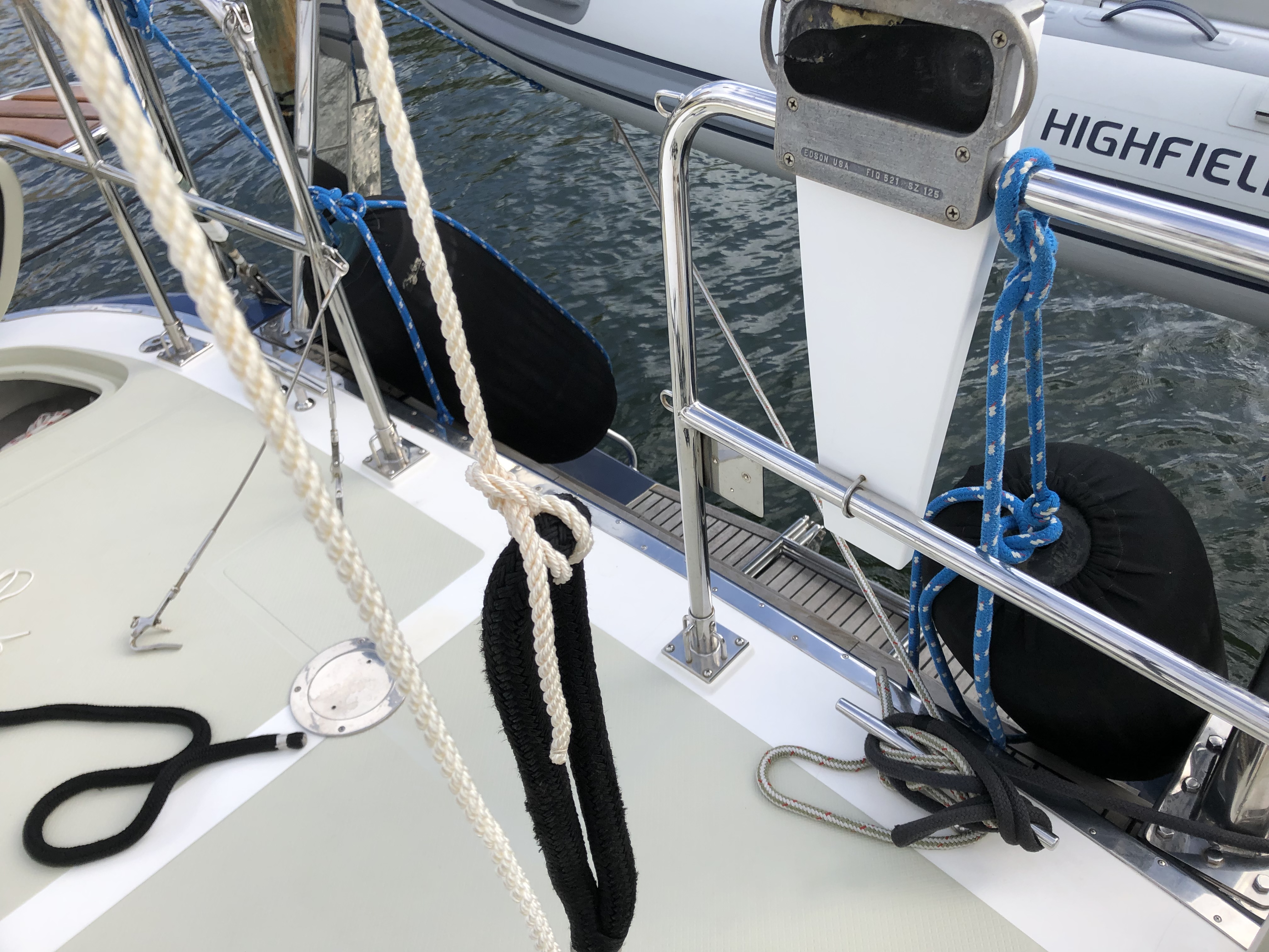 Don’t you hate it when you want to add a dockline to one corner of your boat, but the nearest piling is 15 feet away and much too tall to throw a line over it? On our Hylas 54 we found the prior owners had rigged heaving lines to solve the problem. Heaving lines are relatively light and small, but long lines with a weight on one end. Here’s what ours look like: