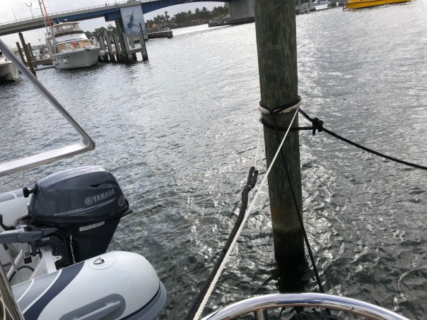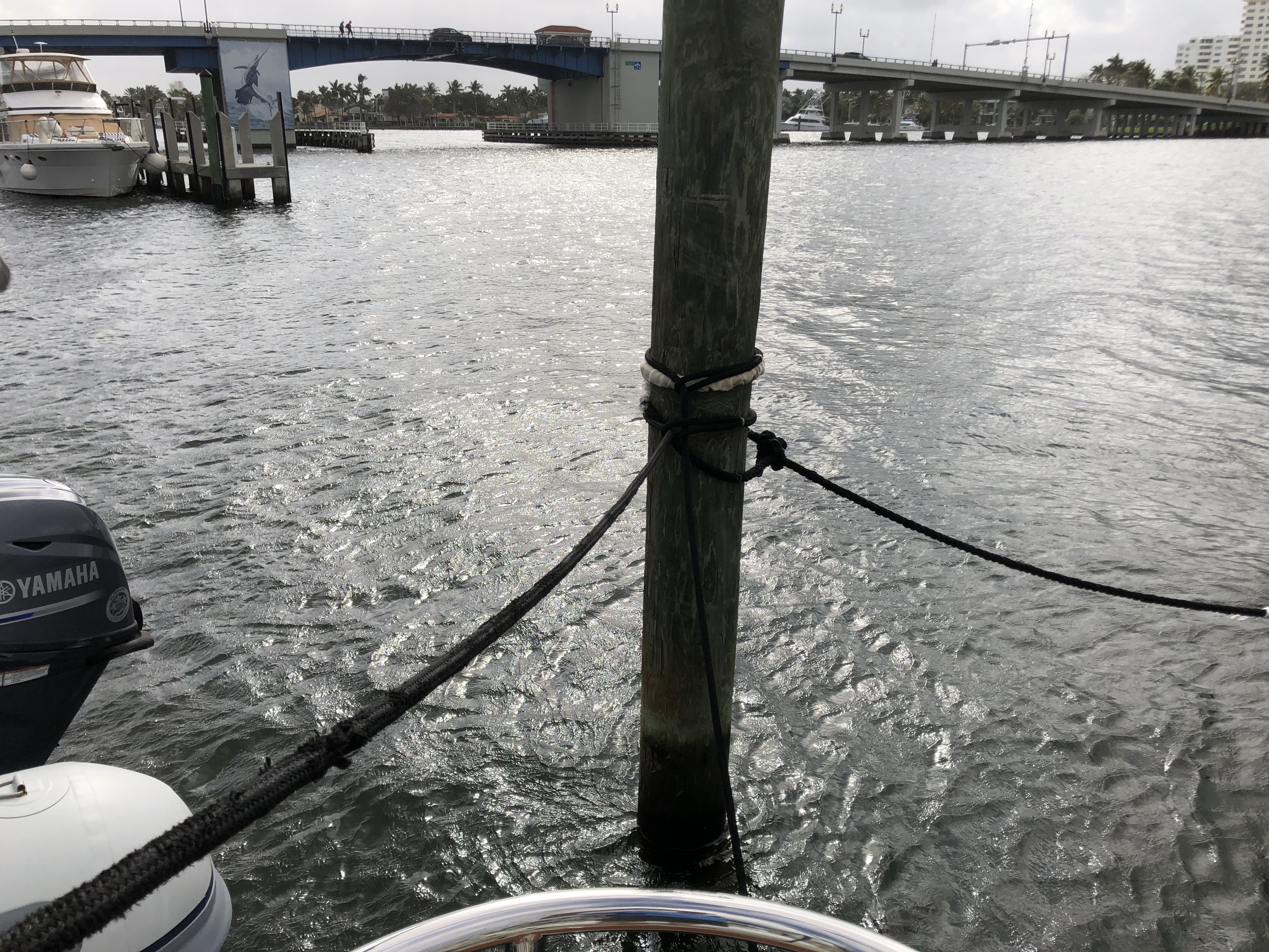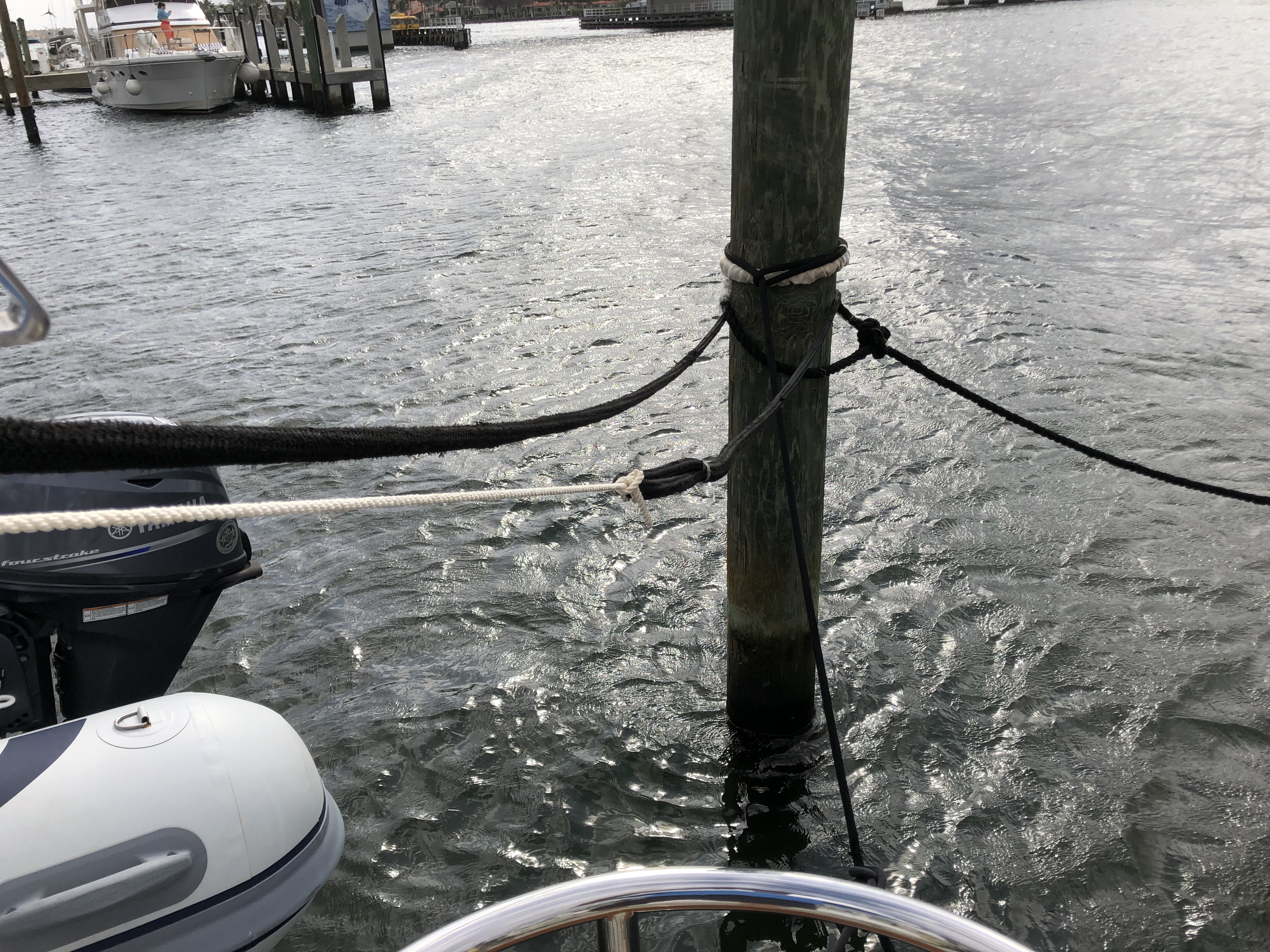 Once you get the loop end of the dock line back in hand, remove the heaving line and run the other end of the dockline through it and pull tight. Success! You’ve now got a dockline fastened to that far away piling.  Time for a rum!
