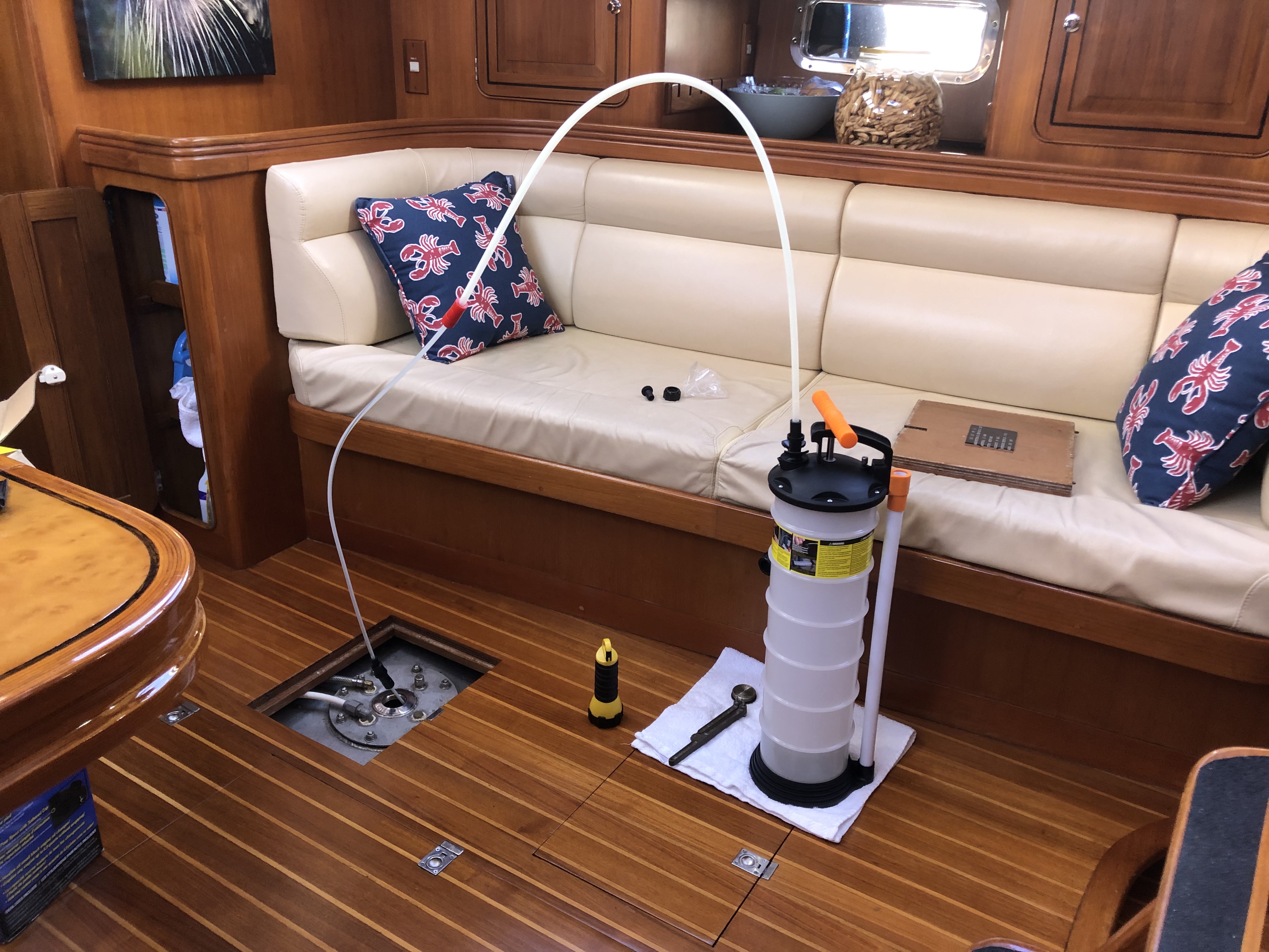 On the Sabre, the tanks were small enough that an ordinary dinghy hand pump could reach the bottom and the last bits of water could be reached with a sponge via the inspection port. On the Hylas, the tanks are much deeper so that solution would not work. So here is the solution I found: a nice vacuum fluid pump meant for marine engine oil changes, etc.