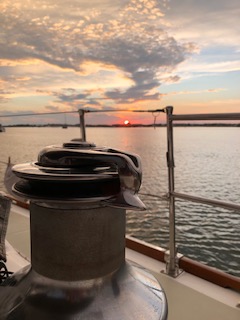 Cape May is a quintessential Jersey shore town with white sand beaches, souvenir stores, restaurants and fun coffee shops, Magic Brain Café was a favorite. Cape May Running Company offers all your running needs.  They were very welcoming offering a great “reopening” sale.  I was able to stock up on nutritional items and some running accessories, even a new pair of sneaks.  There is a State Park/lighthouse and a paved promenade that runs along Beach Ave just about 2 miles.  I found running along the shady streets with quaint Victorian homes to be much more scenic, but, there are plenty of large modern beach homes to see as well.  I enjoyed a beach yoga class (Cape May Yoga NJ), offered to maintain social distancing…why isn’t yoga always on a beach!  During our 4 days in Cape May, we ate onboard most of the time except I enjoyed a lovely lunch at Tisha’s with my childhood best friend who drove 1 1/2 hours from Haddonfield, NJ. The Rover crew also enjoyed an evening out of drinks and steamed clams at Lobster House with a lovely sunset.